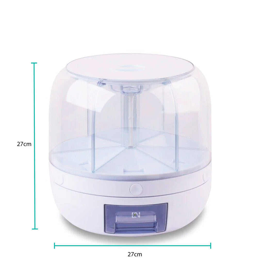 Optimise your kitchen's arrangement and save space with our versatile 6Kg capacity storage compartment, ideal for storing up to six dry food varieties. The 360-degree rotating design provides effortless access to each compartment, with individual buttons for easy dispensing and drawer. This durable container ensures long-lasting utility, while its one-click dispensing feature minimises air exposure.