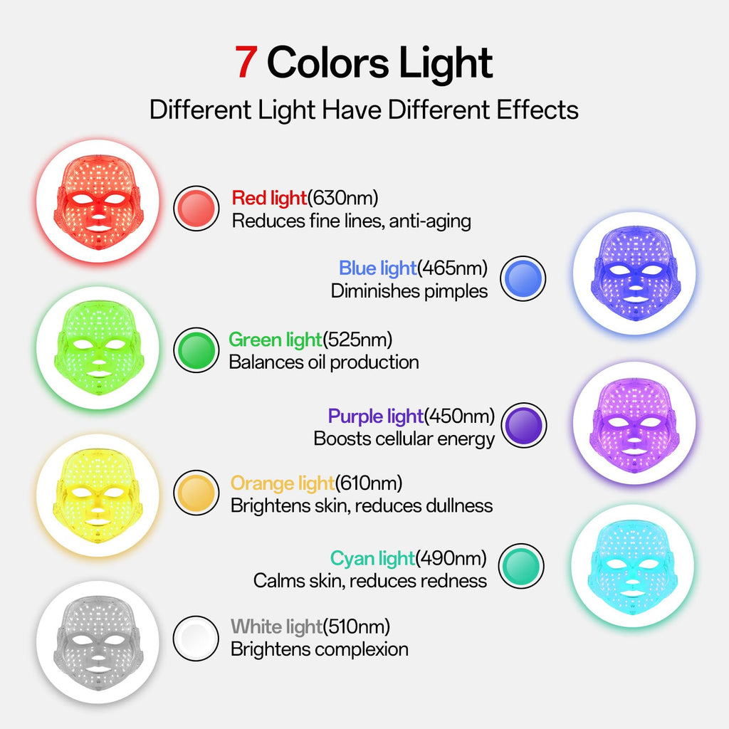 7-Color Light Modes: Red, blue, green, purple, orange, cyan, and white lights target various skin goals like brightness, clarity, and tone.