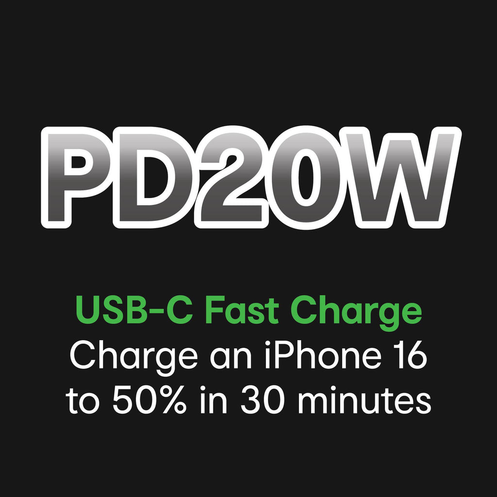 Get 50% charge in 30 minutes*. This 20W USB-C fast charger powers your iPhone 16 or Galaxy device up to 4 faster than standard USB.