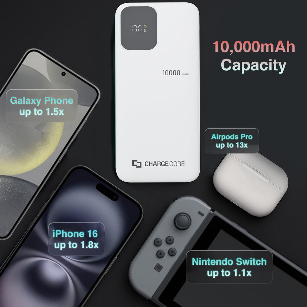 Charge your iPhone, iPad, Android, or Nintendo Switch all from one power bank. No extra chargers. No extra weight.
