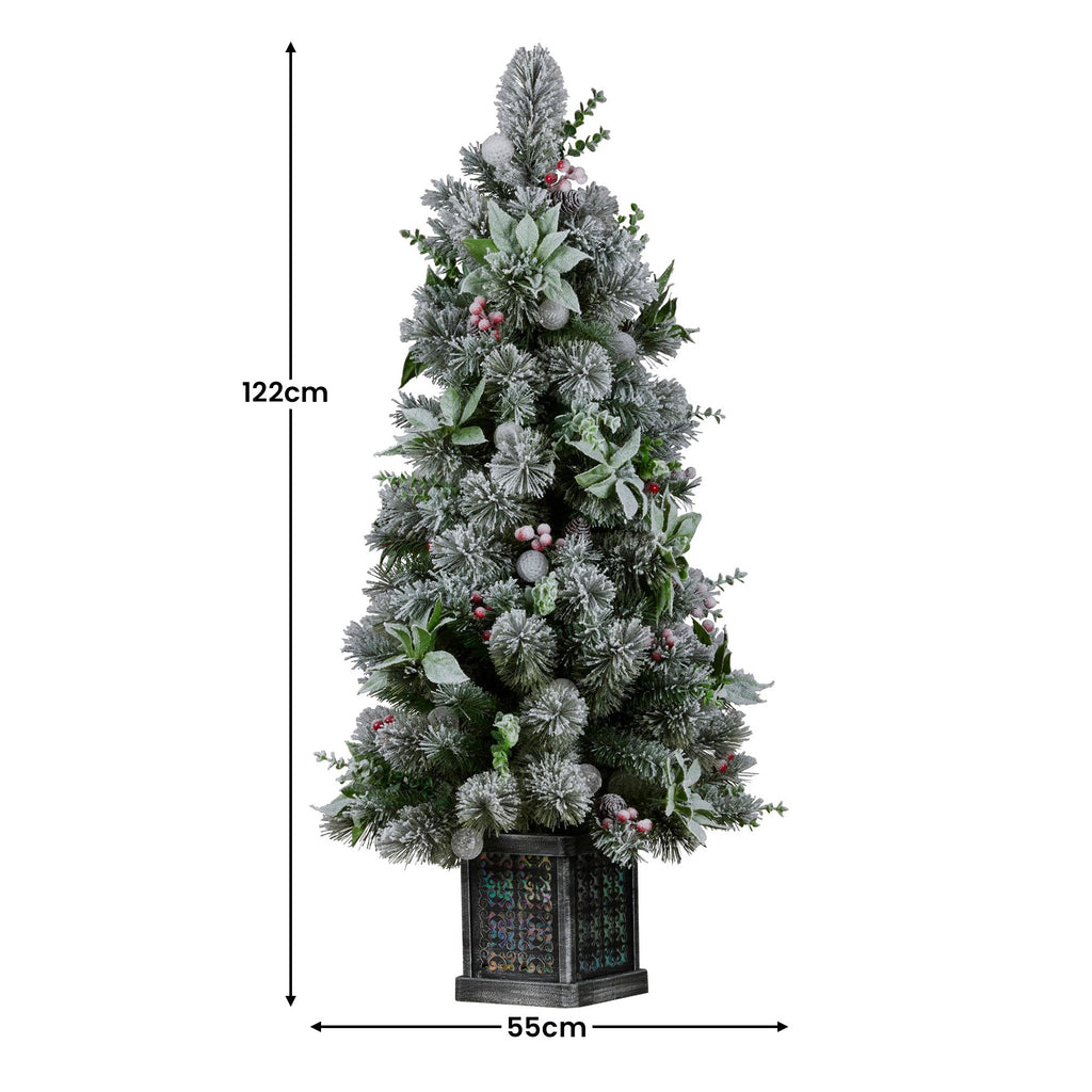 Get your holiday vibes on point with the gorgeous Snowy Crown Pine Christmas Tree. Its lightly frosted foliage gives off those wintry feels and the berries, pine cones and poinsettia flowers add that extra festive touch. Brighten up your room with its 30 LED snowball lights that offer 11 different light settings, including various colours and warm white hues. Plus, the foot pedal control makes it a breeze to switch things up and keep your tree looking fabulous. Great for filling small spots or placed by the entryway, make your holiday setup complete with this stunning 4ft tree!
