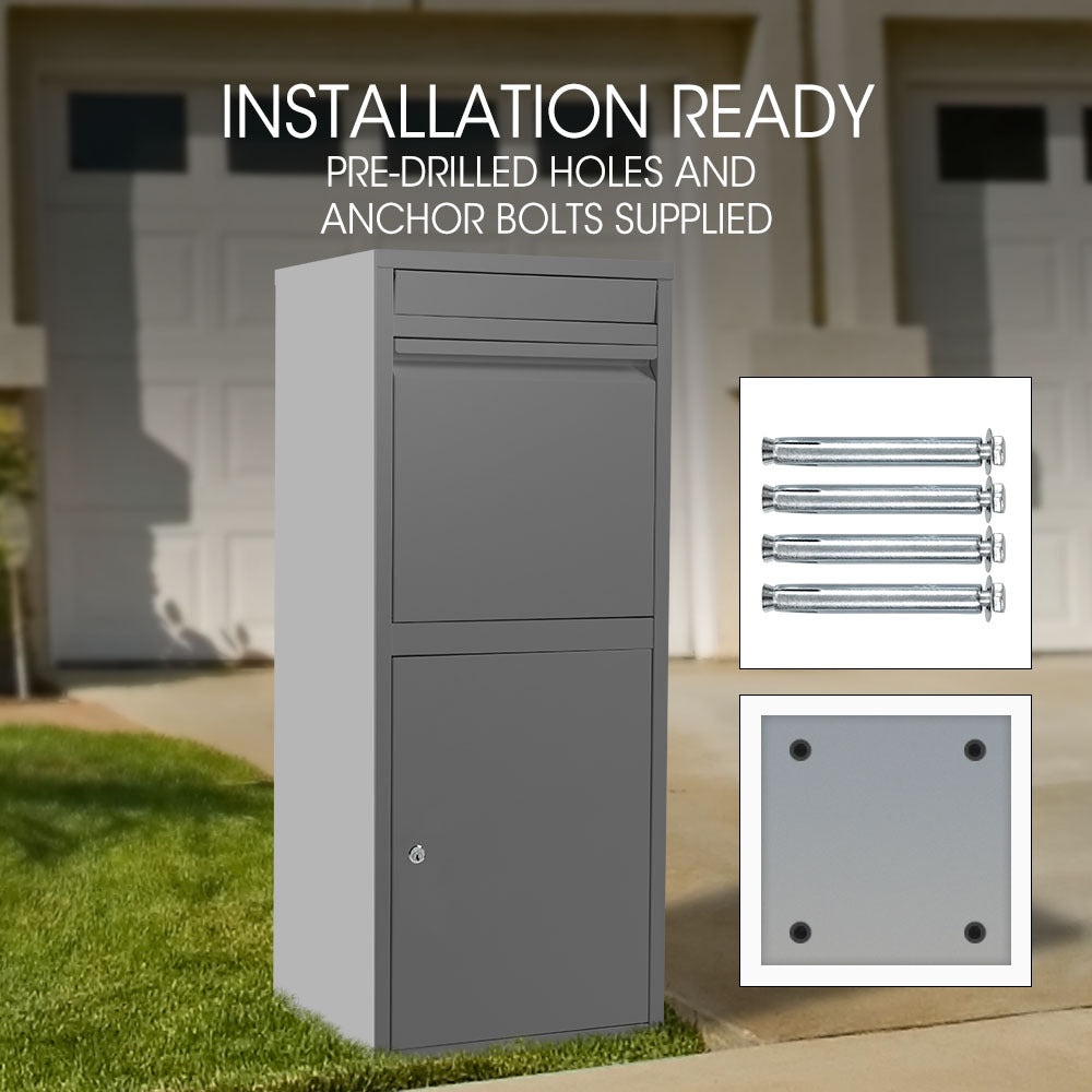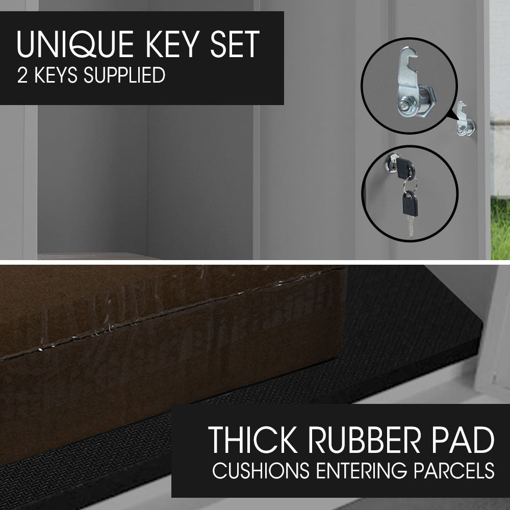 Its simple styling will complement any architectural style and look great in front of your home. Security is paramount with a secure L-shaped lid and theft-proof baffle design that prevents unwanted access to the storage chamber. Equipped with two unique keys, this parcel box guarantees exclusive access.